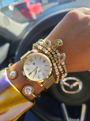 Cada pieza de nuestra colección está cuidadosamente elaborada con 4 baños de oro de 18K, asegurando una calidad y brillo incomparables, mientras que las piezas plateadas cuentan con un lujoso baño de platino para un acabado elegante y duradero. ✨